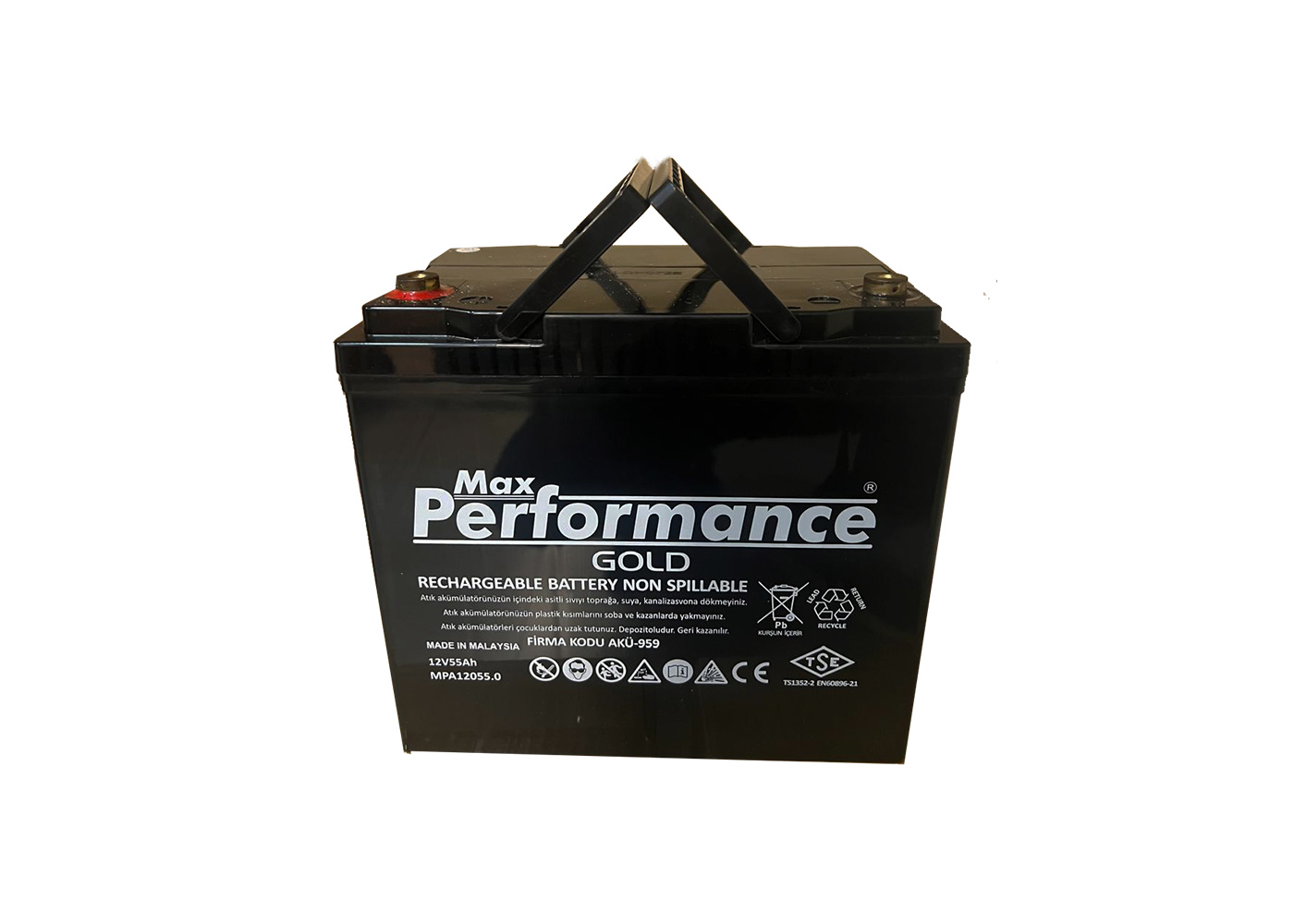 Alimas MPA12055.0 (12V 55Ah) ზომები: 229mm x 138mm x 208mm, წონა: 16.5 კგ